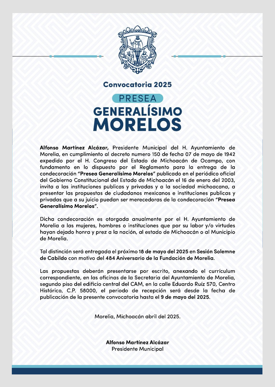 Con la finalidad de honrar a mujeres y hombres cuyas acciones ejemplares enaltecen a nuestro municipio, estado y nación, y que contribuyen al fortalecimiento de la sociedad moreliana, al fomento de los valores cívicos y a la construcción de la paz, el Gobierno Municipal lanzó la convocatoria para la Presea Generalísimo Morelos, la cual permanecerá abierta hasta el próximo 9 de mayo.