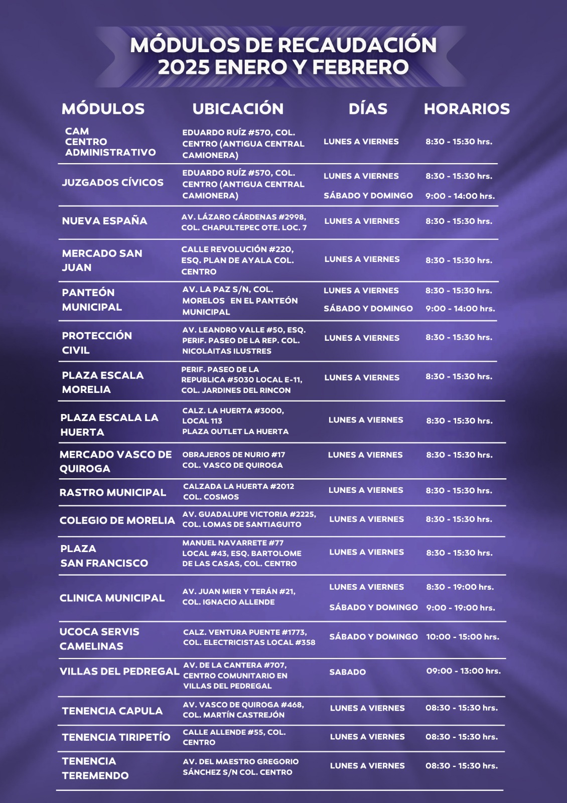 Durante este mes que inicia, las y los contribuyentes podrán aprovechar el descuento del 5%, acudiendo al Centro Administrativo de Morelia (CAM), y los diferentes módulos de recaudación distribuidos por toda la ciudad de Morelia, tanto en la mancha urbana como en tenencias.