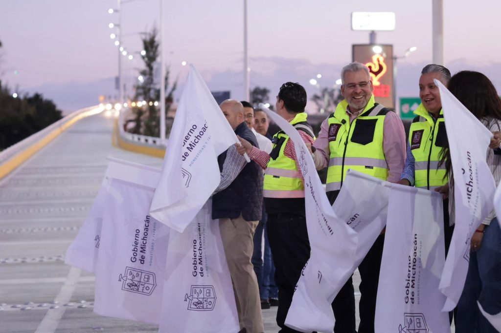 El gobernador Alfredo Ramírez Bedolla abrió a la circulación uno de los puentes del distribuidor vial de la salida a Pátzcuaro, en el sentido del libramiento a la calzada La Huerta, que dará solución vial y seguridad a usuarios y habitantes de la zona sur de Morelia.
