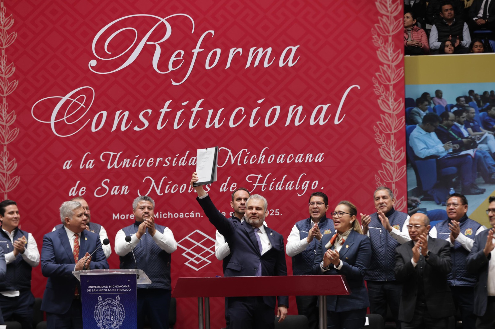 Ante el pleno de la comunidad universitaria, el gobernador Alfredo Ramírez Bedolla firmó el Decreto de Promulgación de la Reforma Constitucional a la Universidad Michoacana de San Nicolás de Hidalgo (UMSNH), garantizándose así la asignación del 4.5 por ciento del presupuesto estatal para la Máxima Casa de Estudios, autonomía plena y elevación a rango constitucional la democratización de la elección del o la rectora y de los sistemas de pensiones y jubilaciones.