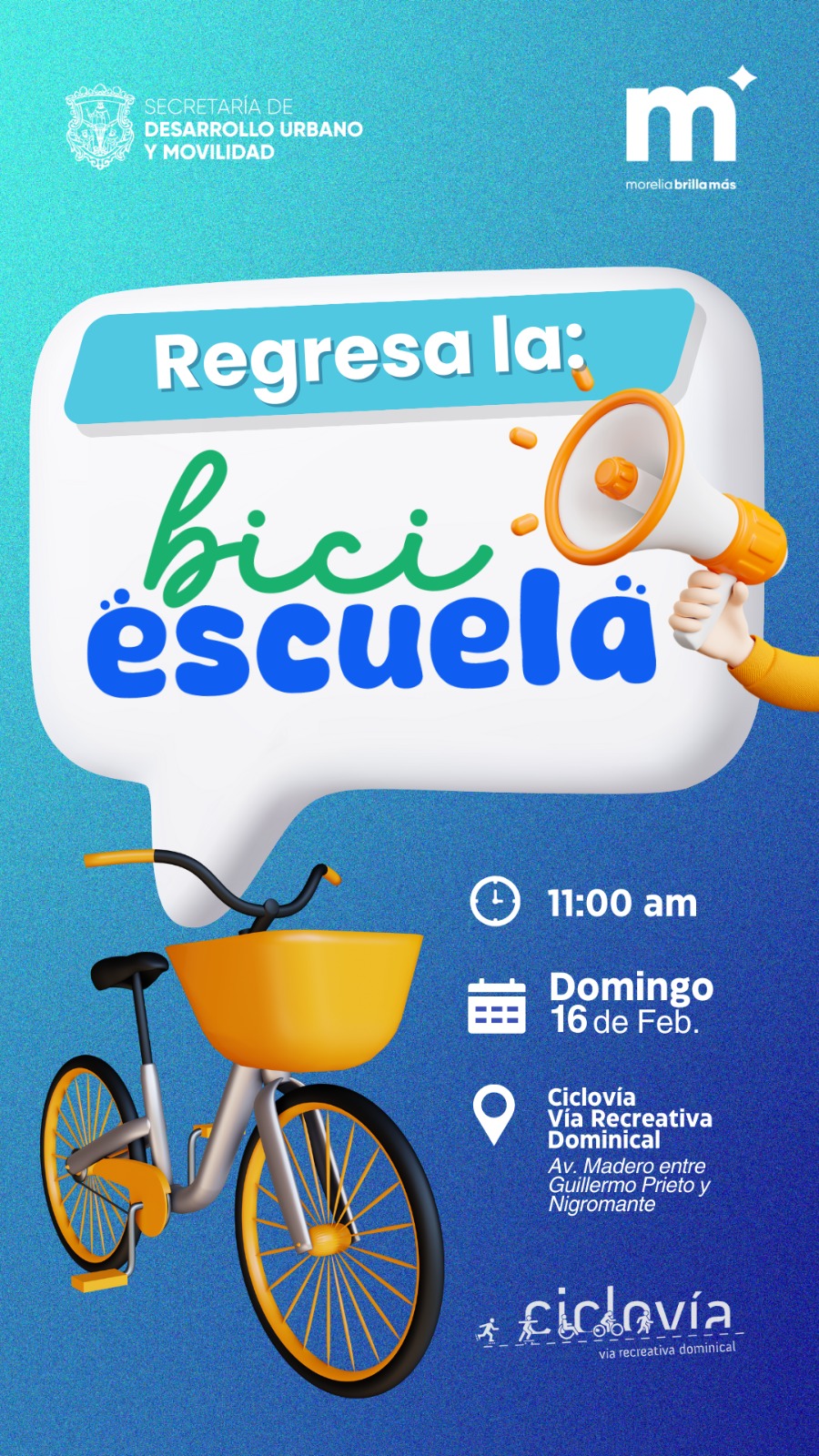 La actividad se llevará a cabo el próximo domingo 16 de febrero a las 11:00 a.m. sobre la avenida Madero en el tramo comprendido entre las calles Guillermo Prieto y El Nigromante, donde instructores capacitados brindarán orientación para que las y los asistentes aprendan a andar en bicicleta de manera segura y adquieran conocimientos sobre movilidad urbana.