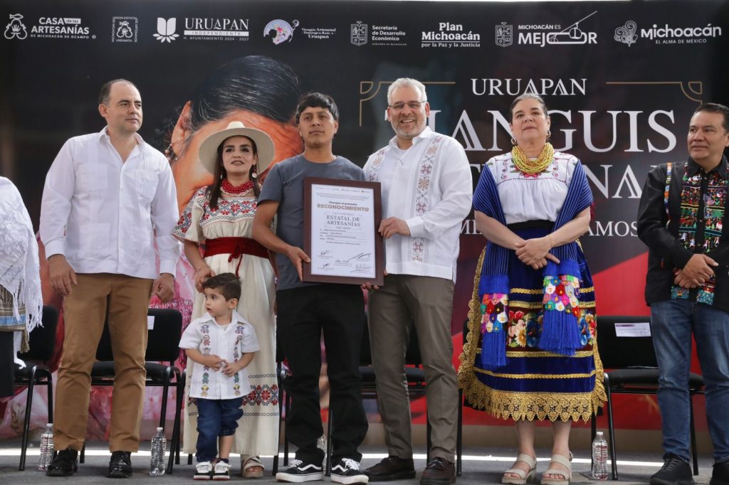 El mandatario entregó el primer lugar a la artesana de la comunidad de Cocucho, Ceferina Ascencio Molina; el galardón especial a Ester Paredes Punzo, de Santa Clara del Cobre; el premio “Antonio Hernández González”, al artesano de Capula, Miguel de la Cruz Hernández; y el galardón “Victoriano Salgado Morales”, a Adán Rebollar Avilés; y el premio “Arturo Olivares Gallardo” al artesana uruapense, Juan Valencia Villalobos.