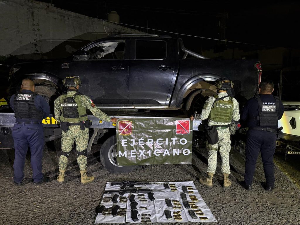 Quiroga.- Elementos de las secretarías de Seguridad Pública (SSP) y de la Defensa Nacional (Defensa) aseguraron dos vehículos, uno de ellos con reporte de robo, en los cuales fueron localizados dos armas largas, 409 cartuchos útiles y cargadores.